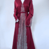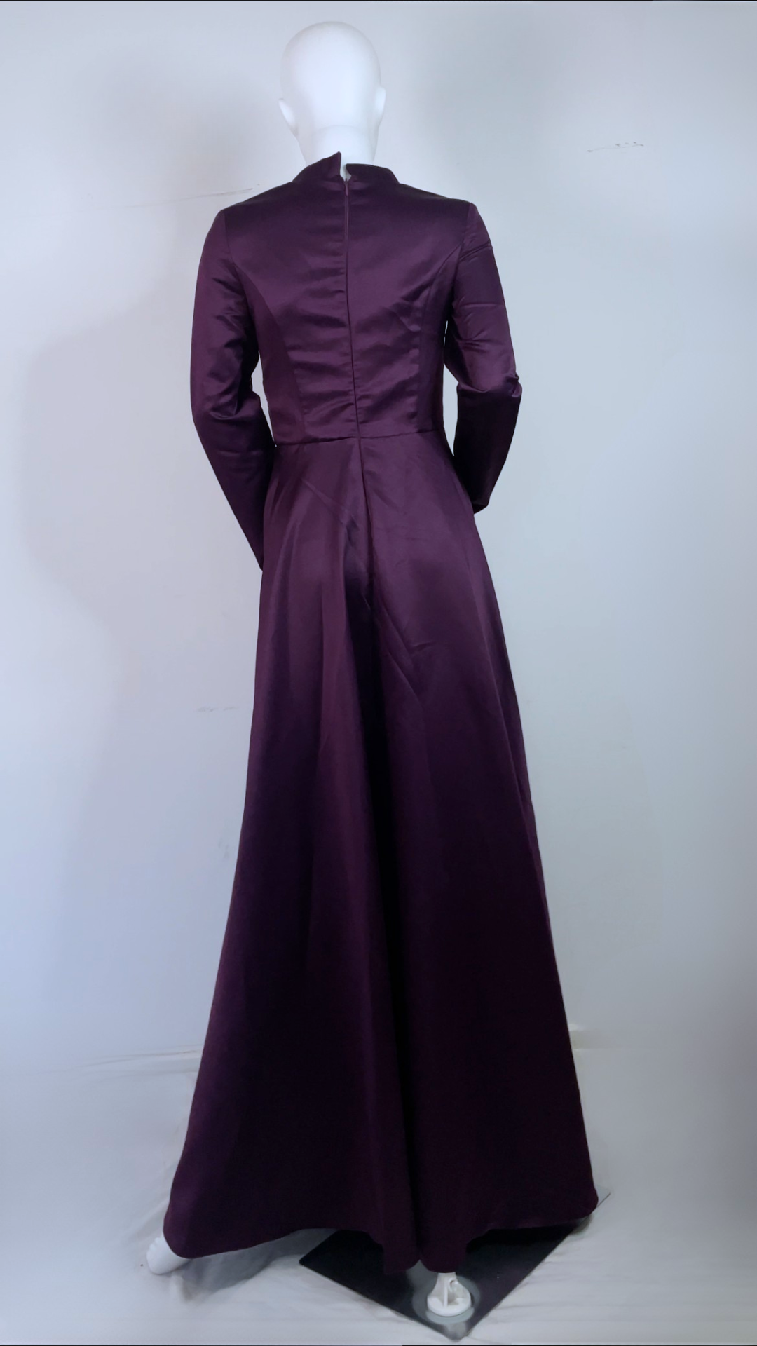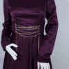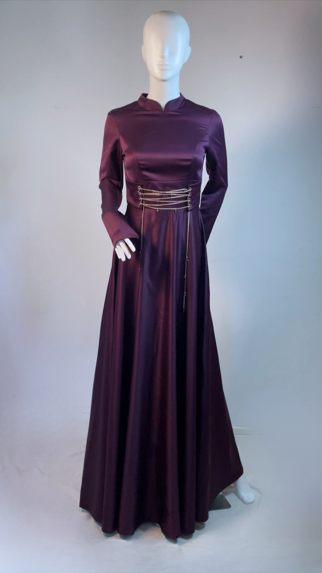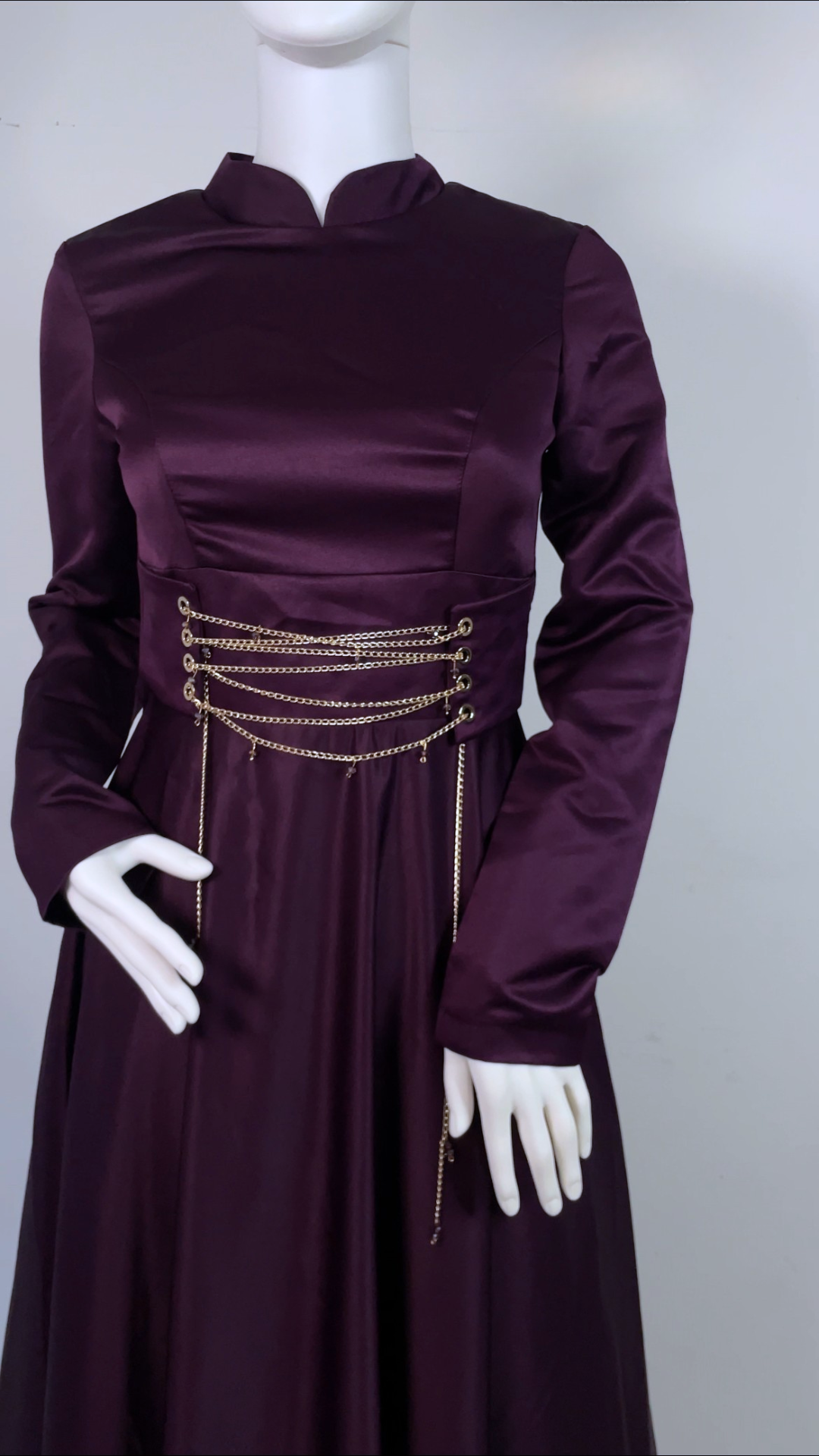 Simple yet elegant aubergine satin dress; beautiful corset like chain details