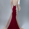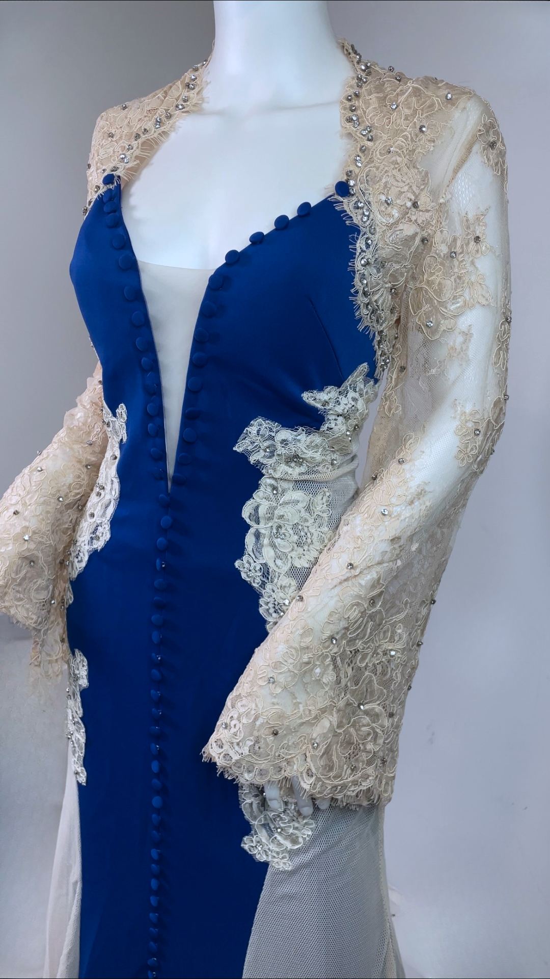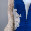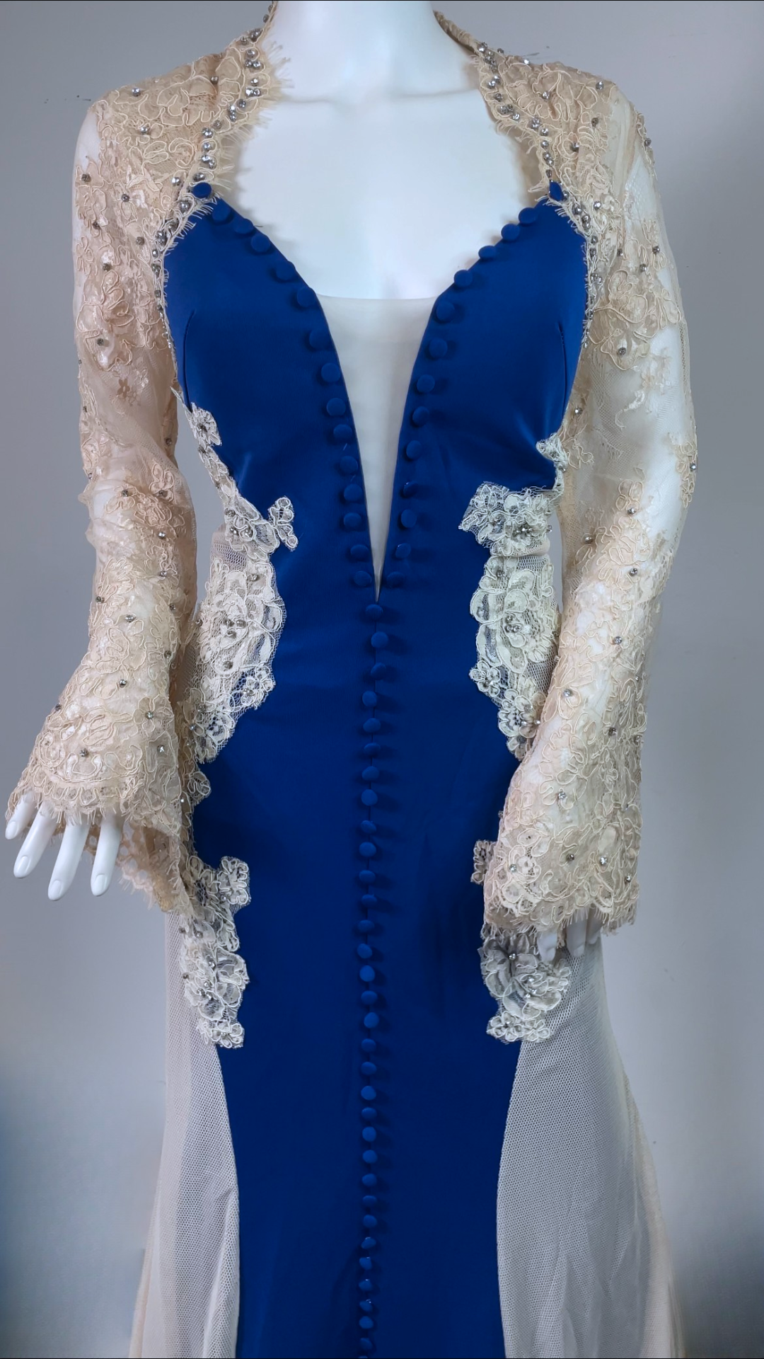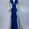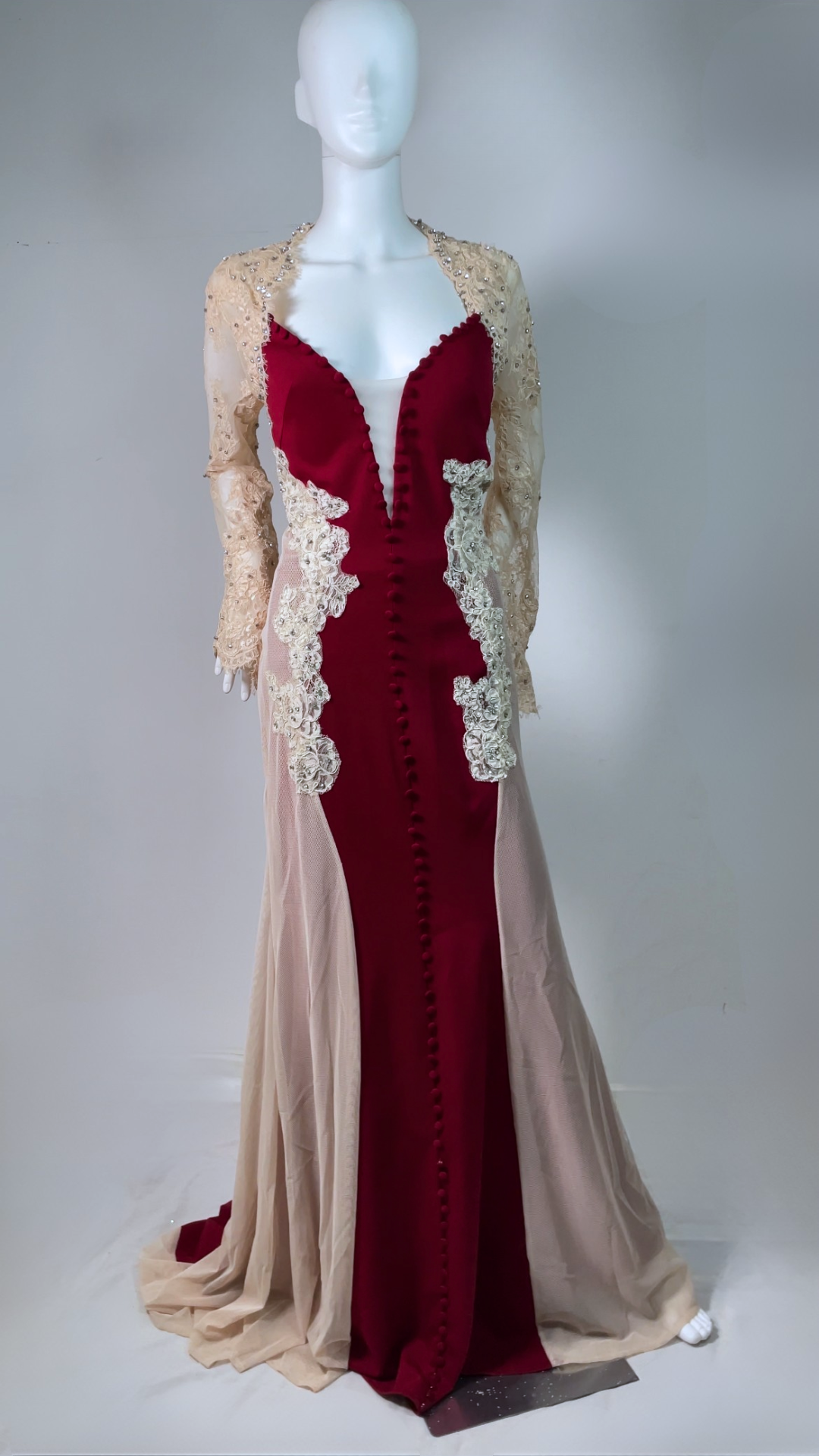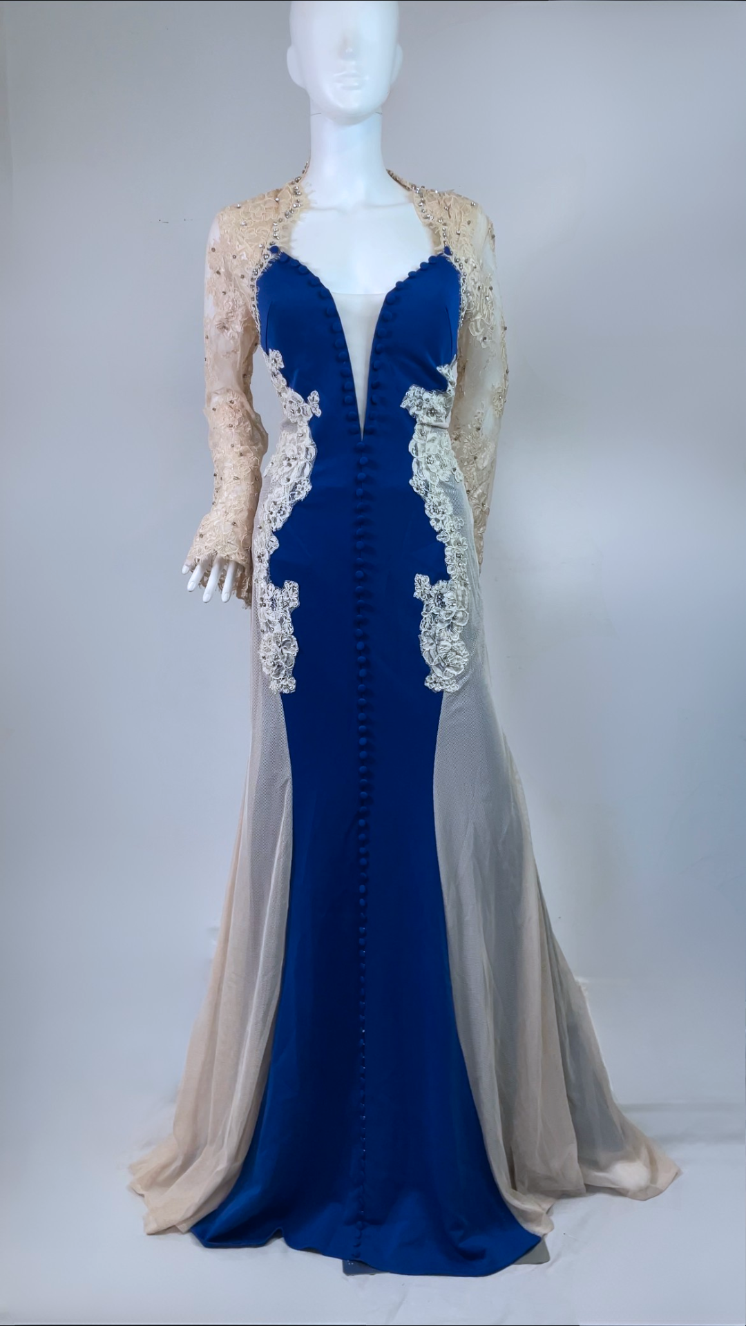Step into timeless glamour with this exquisite full-length evening gown. Designed with a deep neckline, long embellished lace sleeves, and a graceful train. The stretch fabric ensures comfort and a flattering silhouette, while the detailed appliqué, diamante accents, and fabric-covered buttons add a luxurious finish. Has padded bra built in