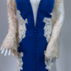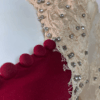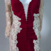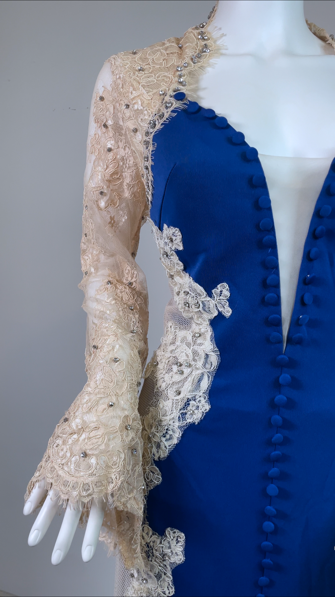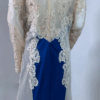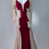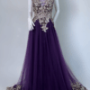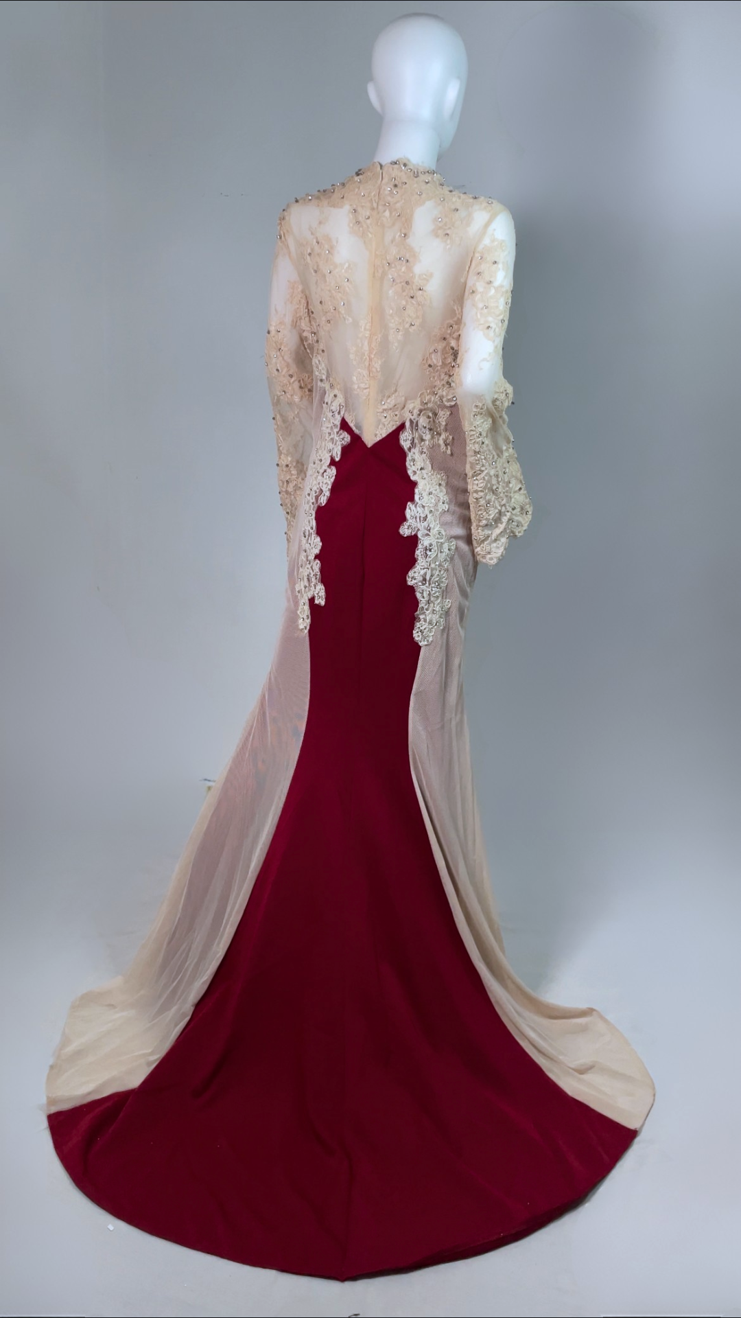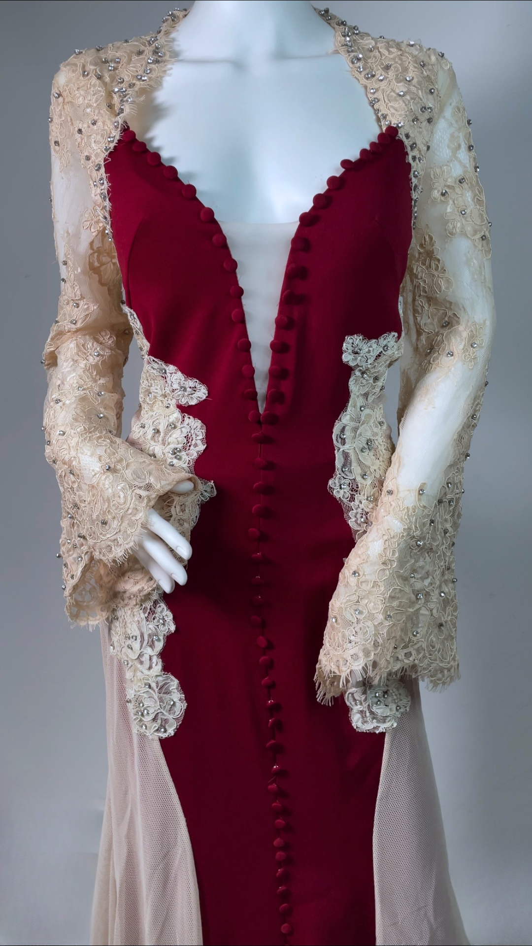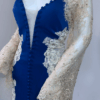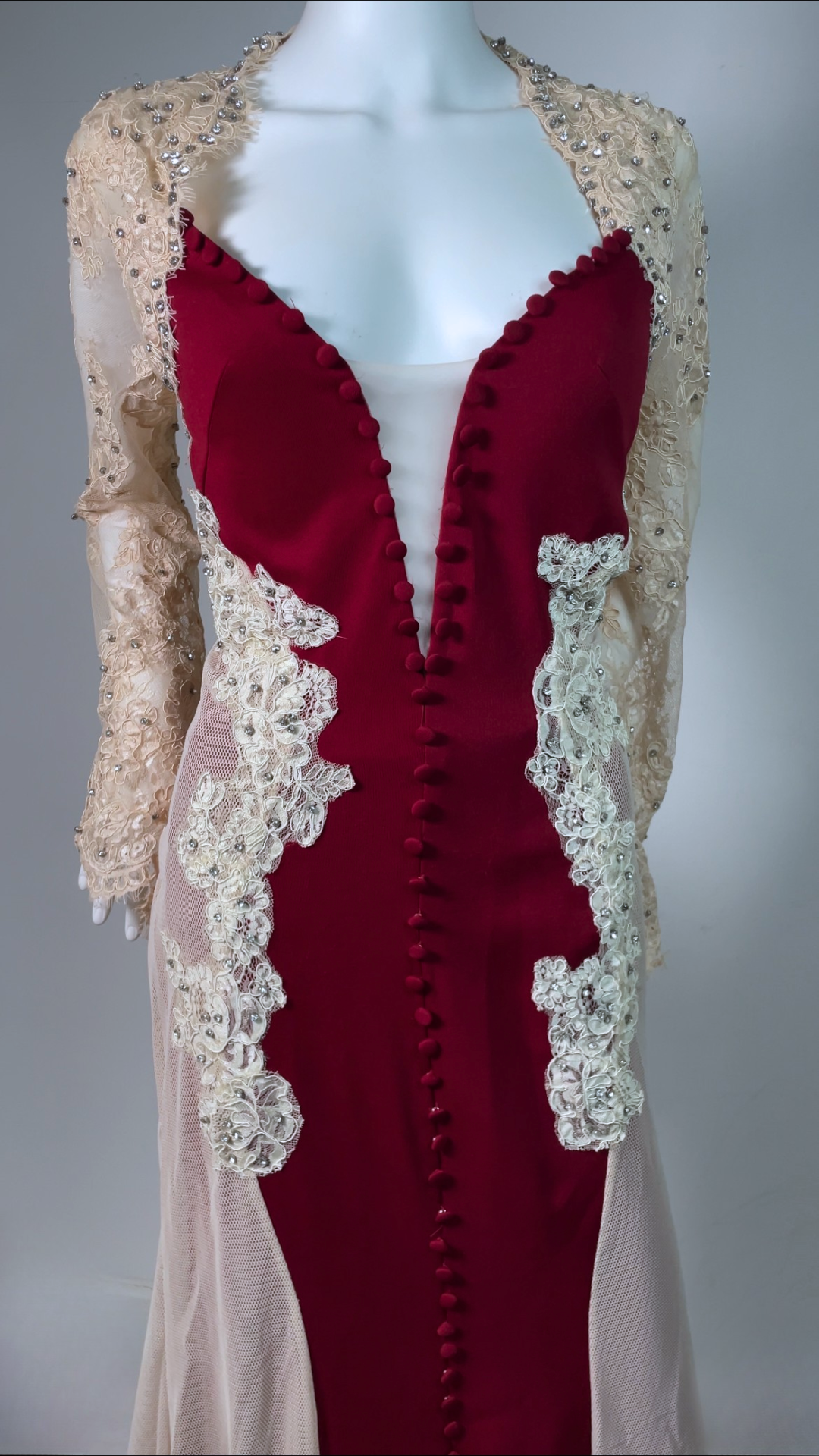 Step into timeless glamour with this exquisite full-length evening gown. Designed with a deep neckline, long embellished lace sleeves, and a graceful train. The stretch fabric ensures comfort and a flattering silhouette, while the detailed appliqué, diamante accents, and fabric-covered buttons add a luxurious finish. Has padded bra built in