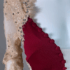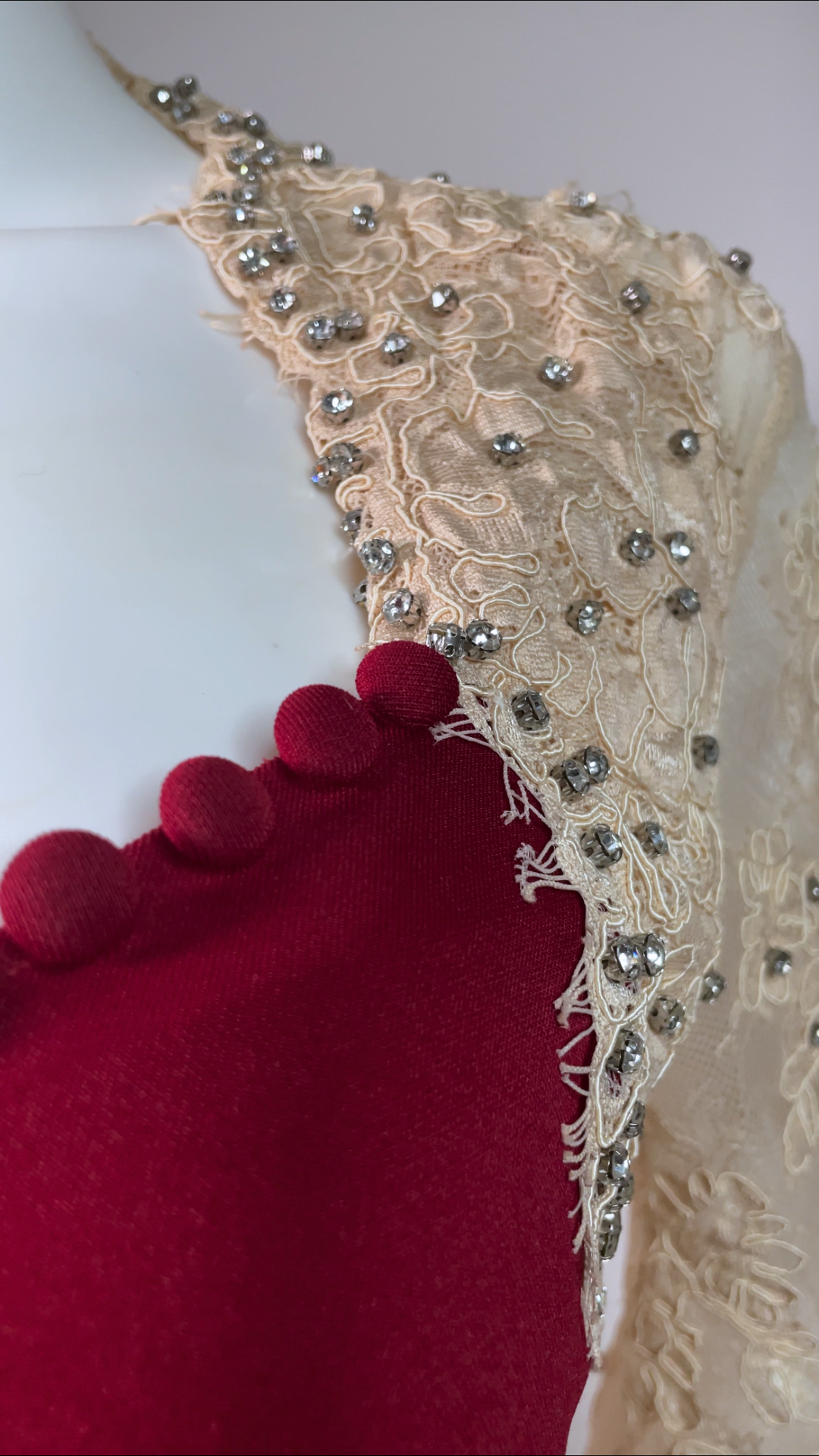 Deep neckline with fabric-covered buttons