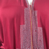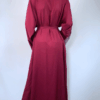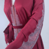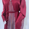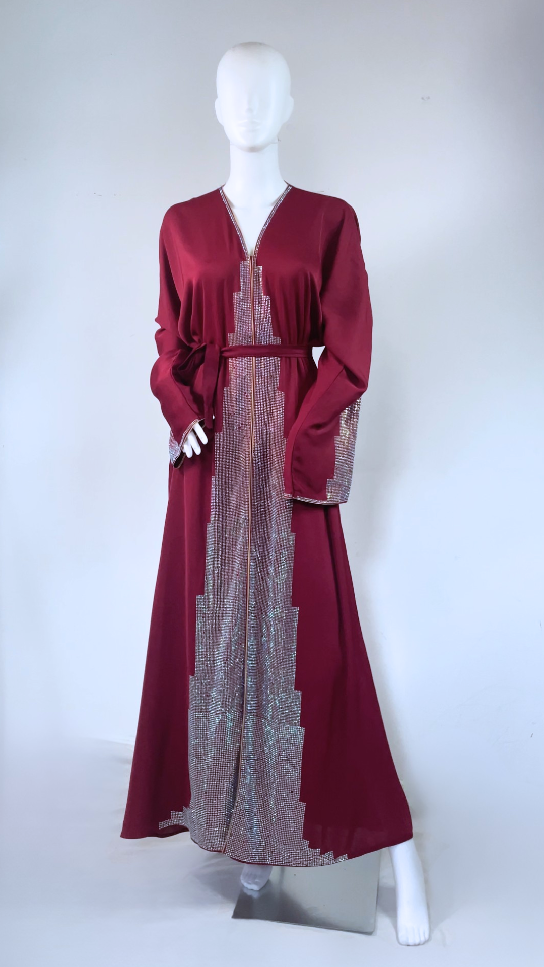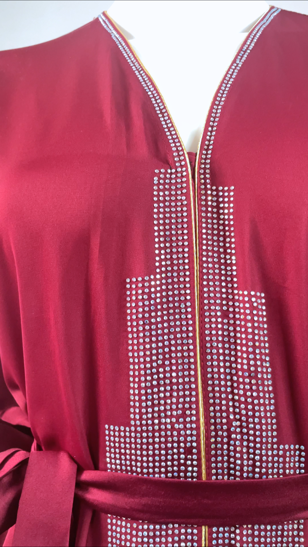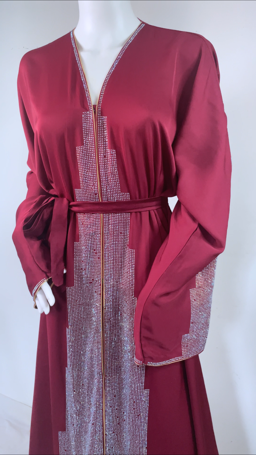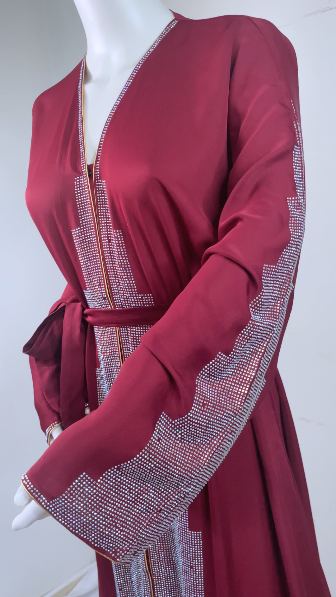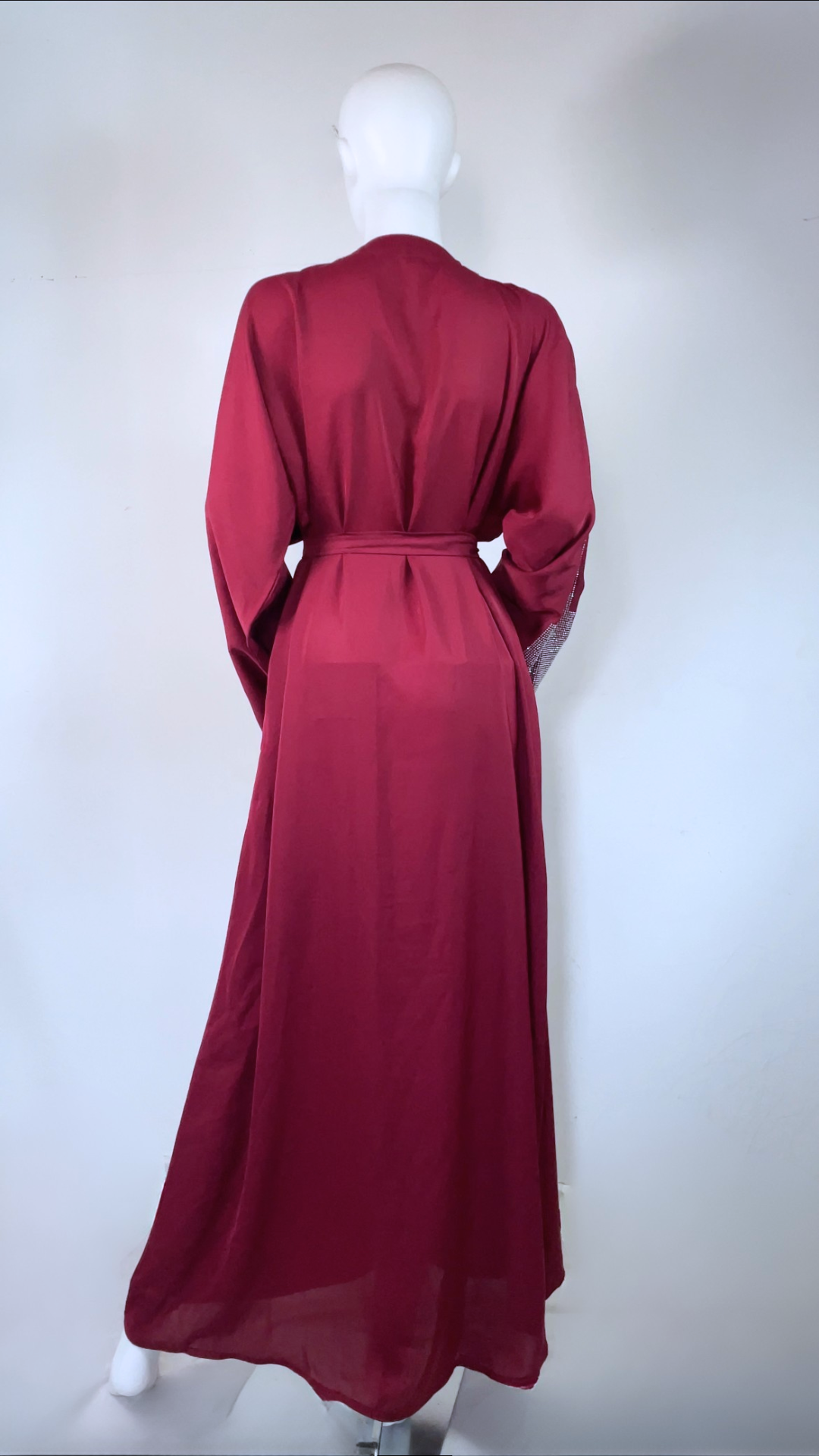 2 piece Deep Red Diamante abaya overcoat with separate tie to synch at waist; can be worn without tie for a more flowy modest look