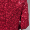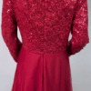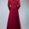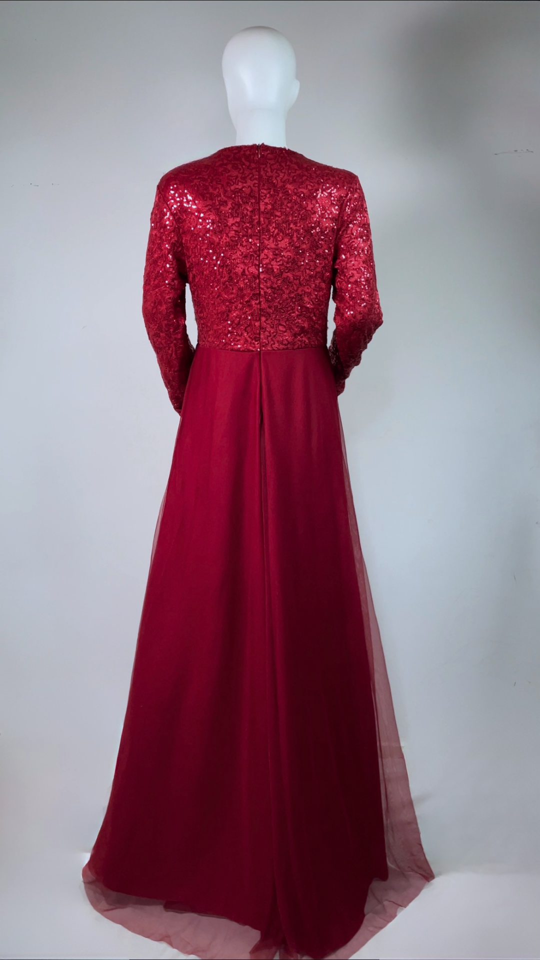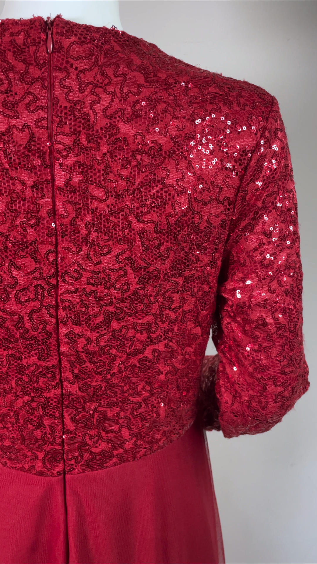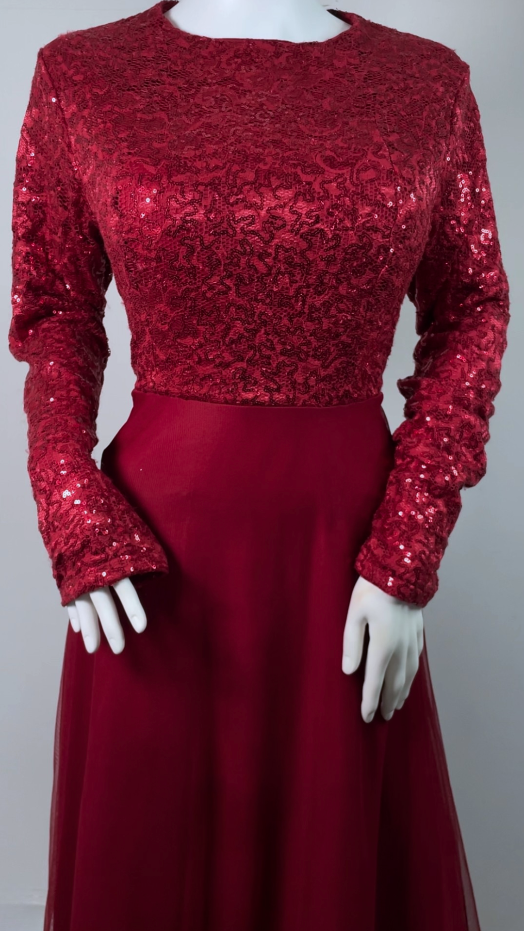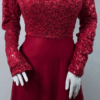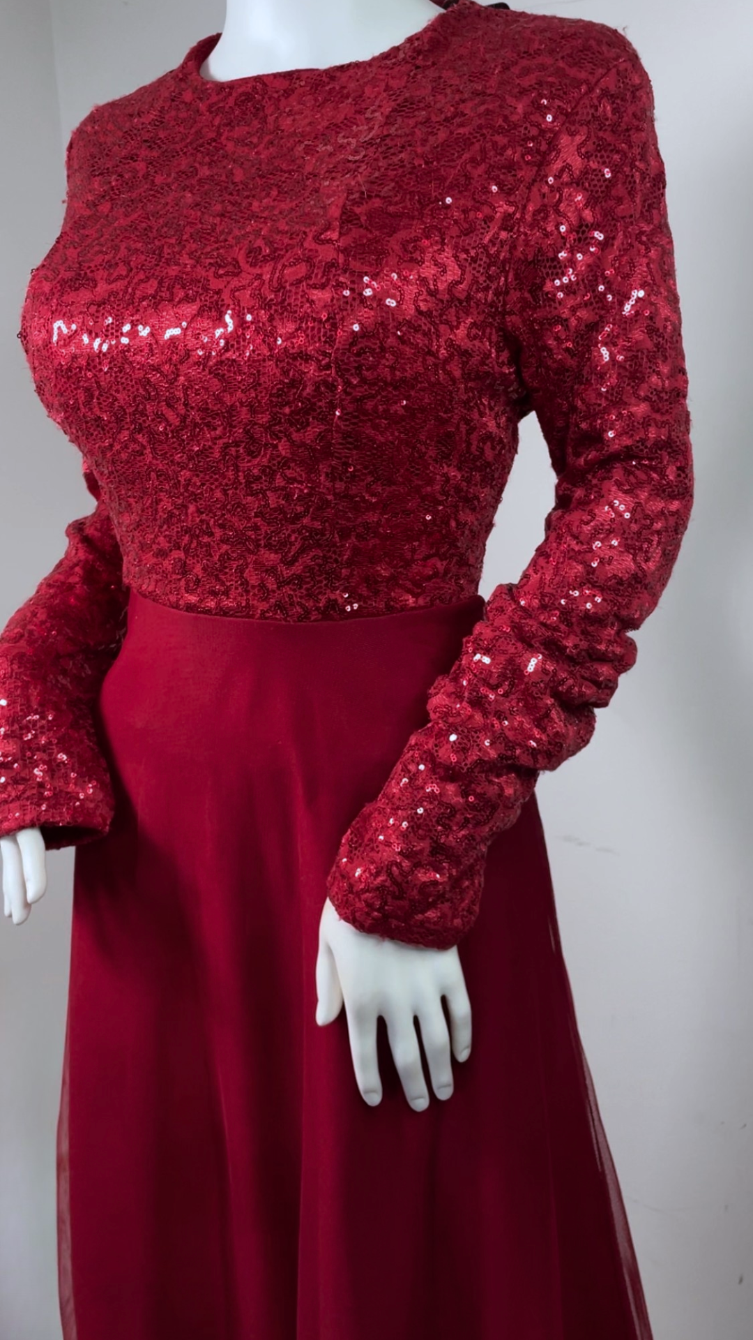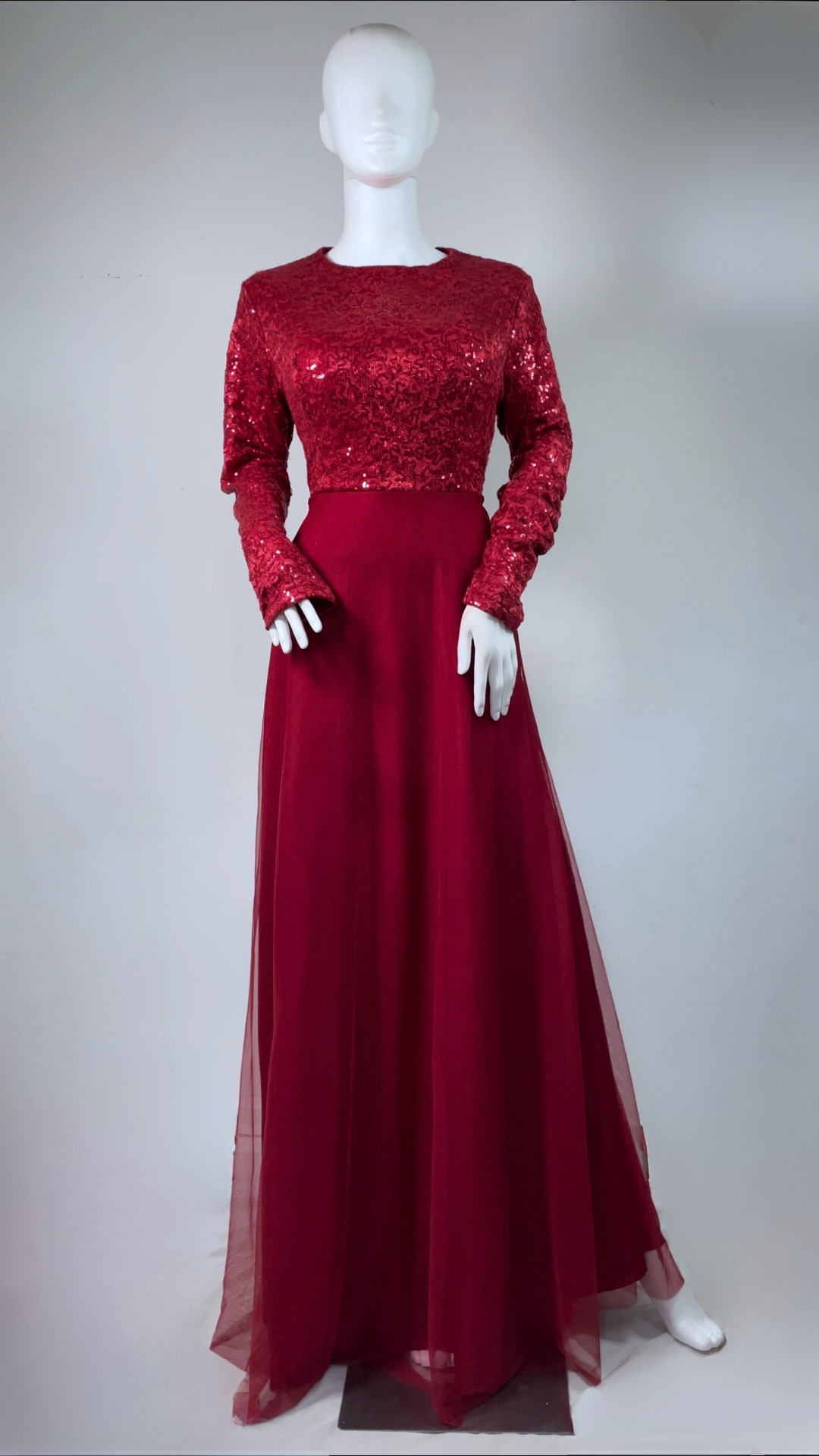 Strawberry red full-length gown featuring sequin-detailed bodice and sleeves, flowy tulle skirt, and invisible zip fastening. Fully lined with soft stretch fabric and built-in bra padding for comfort and a flattering fit.